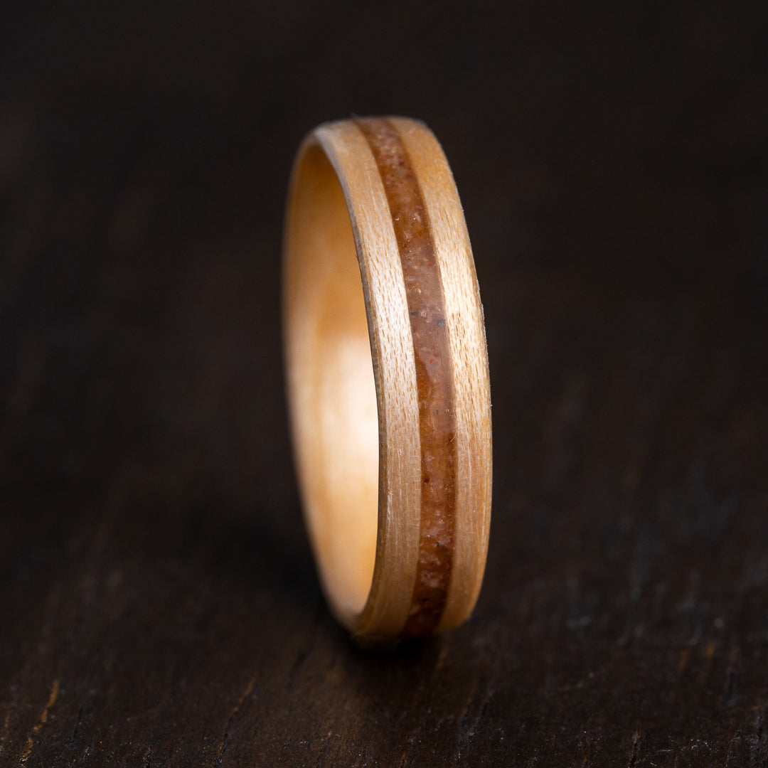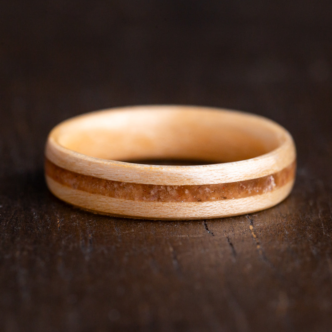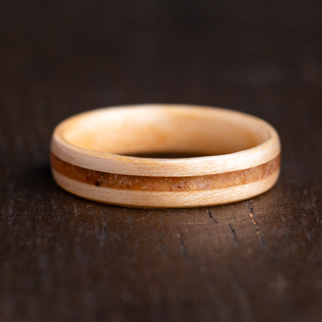 Our Amethyst on Maple ring. This elegant piece features the February birthstone, known for its strong symbolic ties to love and spirituality. Each stone is carefully inlaid into a unique maple wood band, creating an earthy and beautiful accessory.