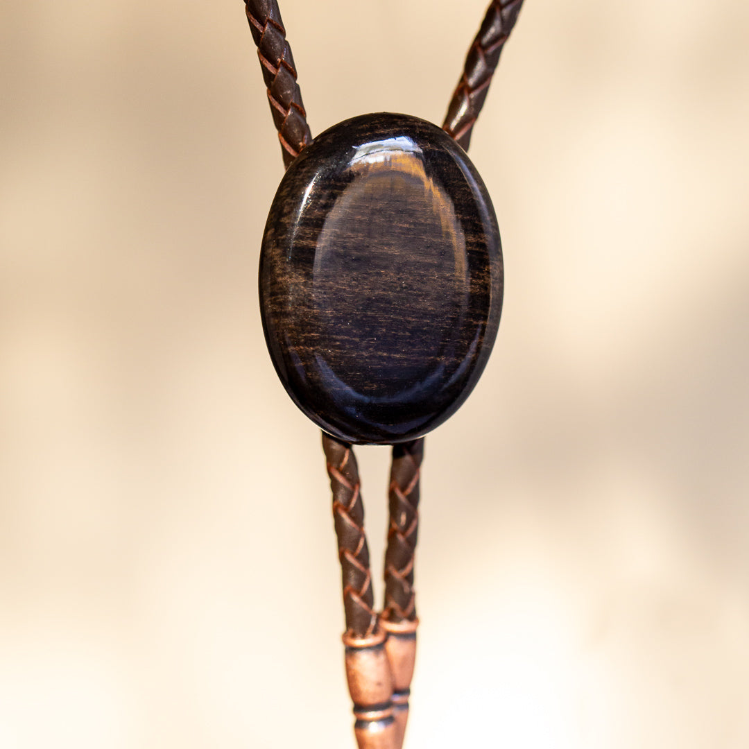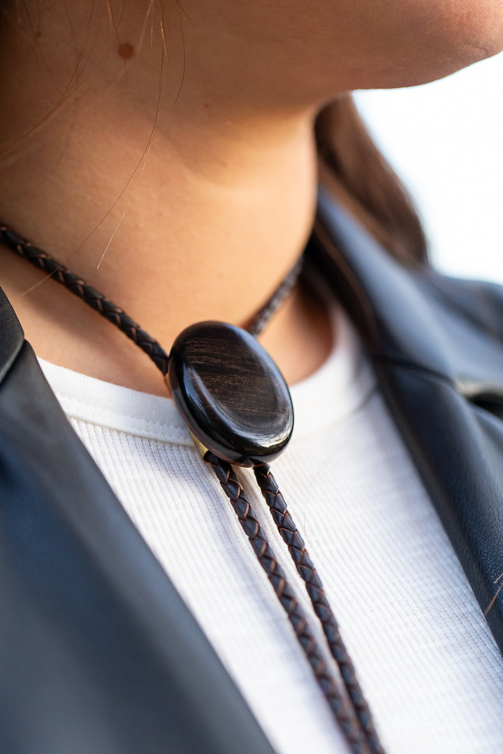 Introducing our macassar-ebony bolo tie. Hand-crafted with genuine leather tassels and copper tips, this non-traditional wooden tie stands out with its bold design. The glossy water proof polish adds durability for all your daring journeys.