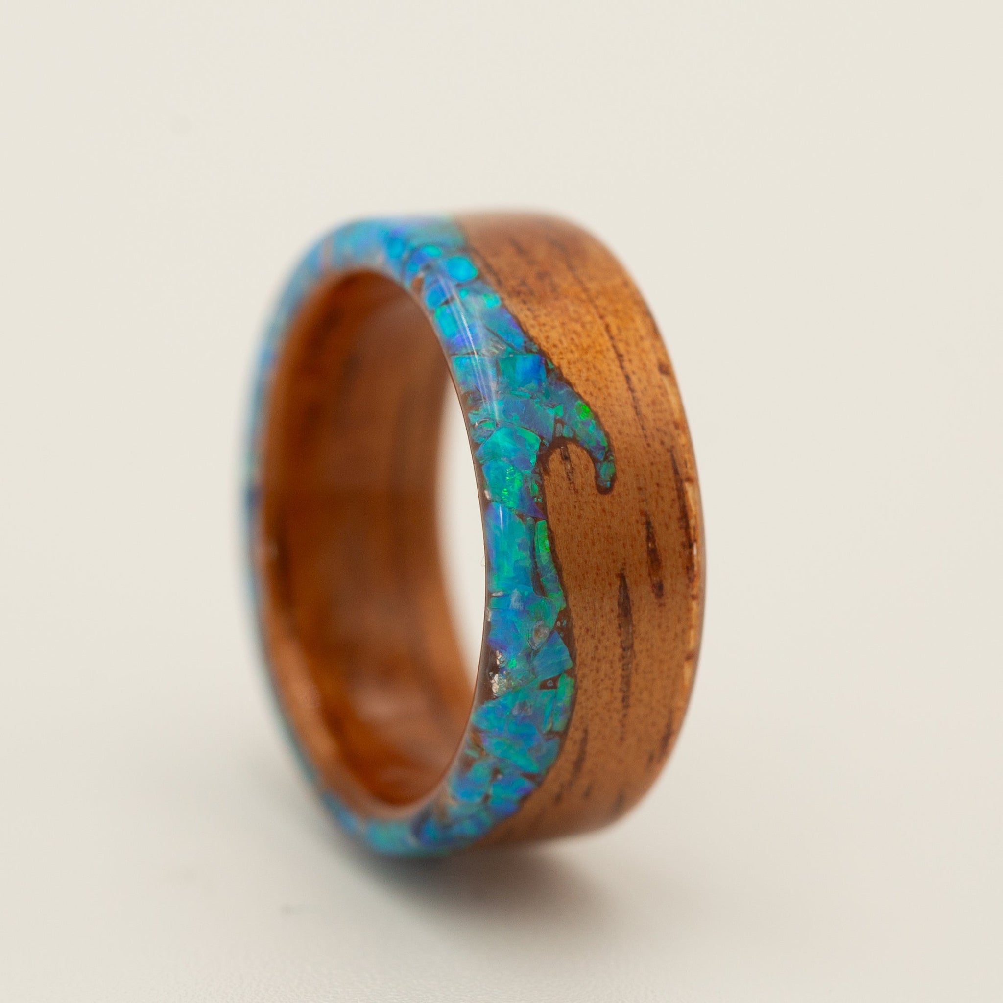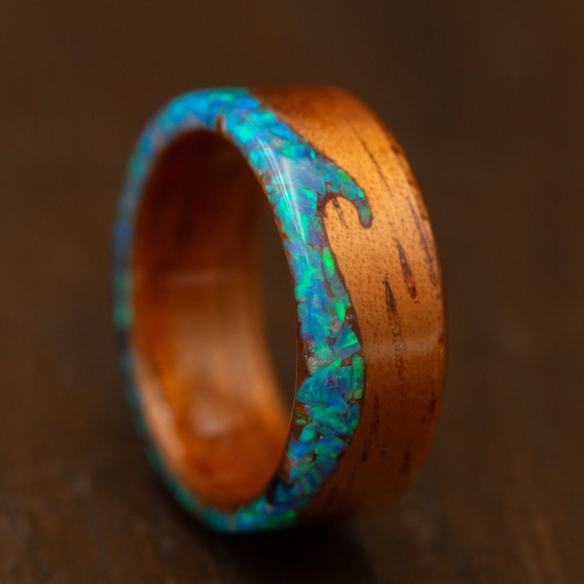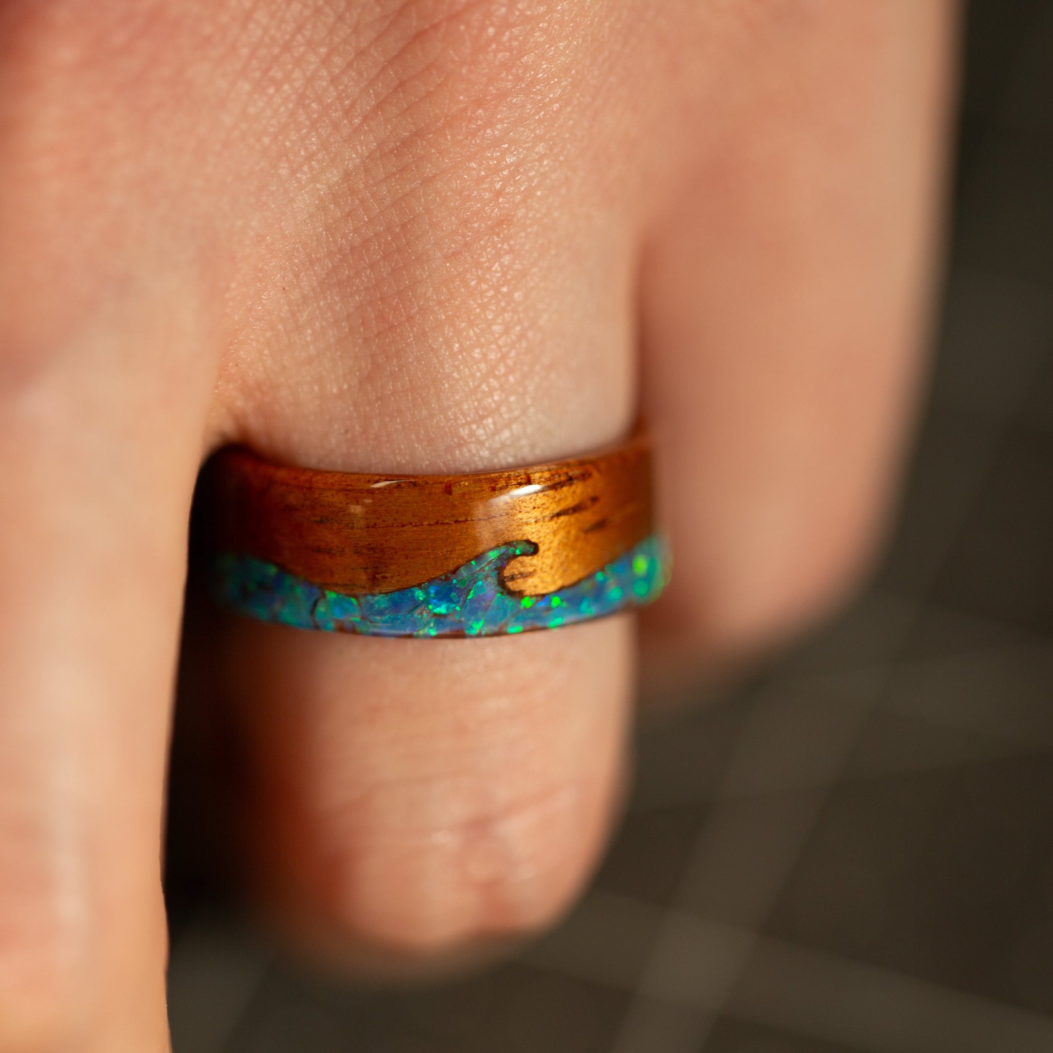 Ride the waves with our Koa & Blue Pacific Opal Waves ring. Made from Koa Wood and featuring a gorgeous wave design with a blue opal inlay, this ring will take you back to the sea. Perfect for those who live for the sea and want to add a touch of originality to their style.