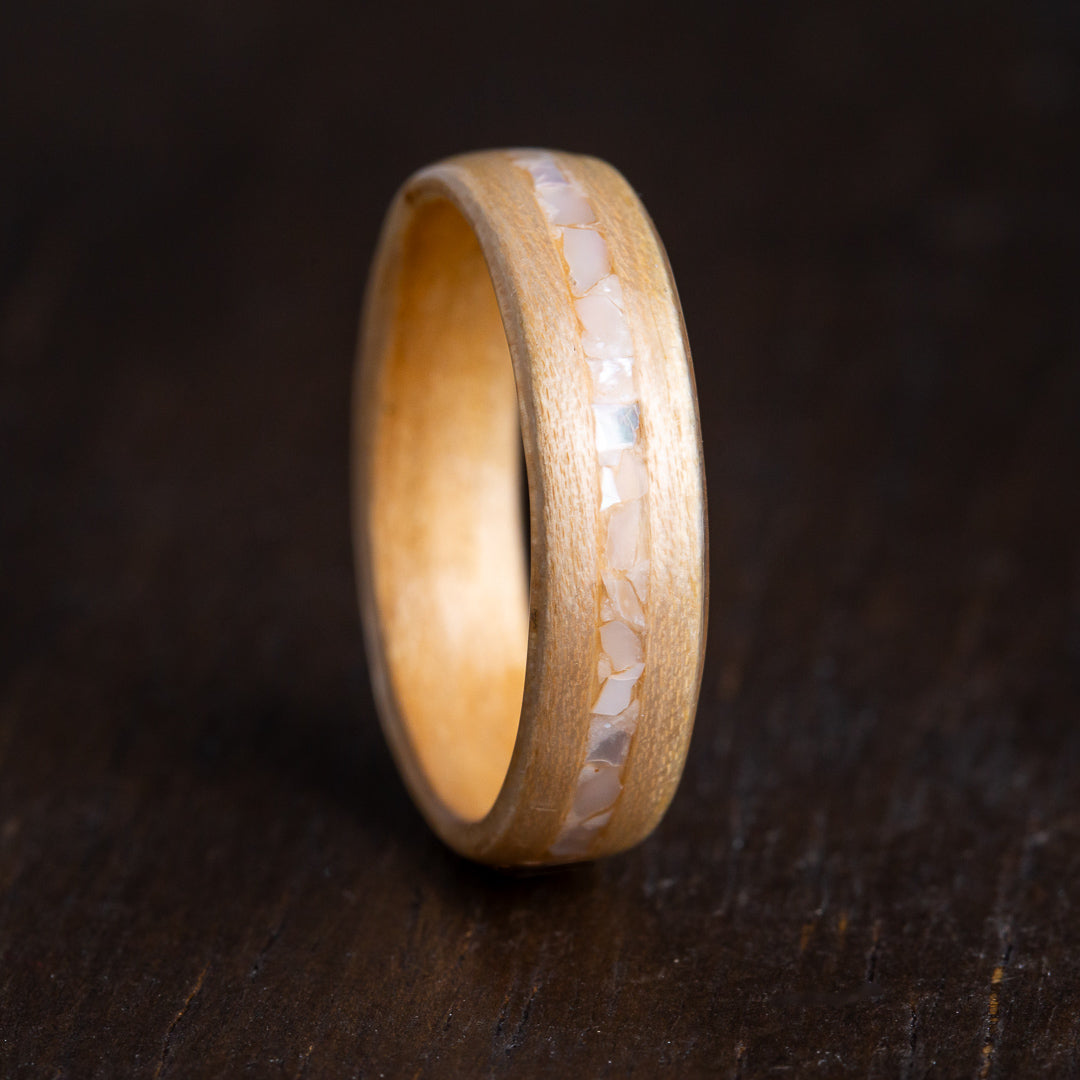 Embrace the delicate beauty of Mother of Pearl on Maple. This wood ring captures sweet simplicity with its June birthstone, symbolizing purity, humility, and innocence. Durable and waterproof, it's the perfect choice for those who appreciate natural elegance.
