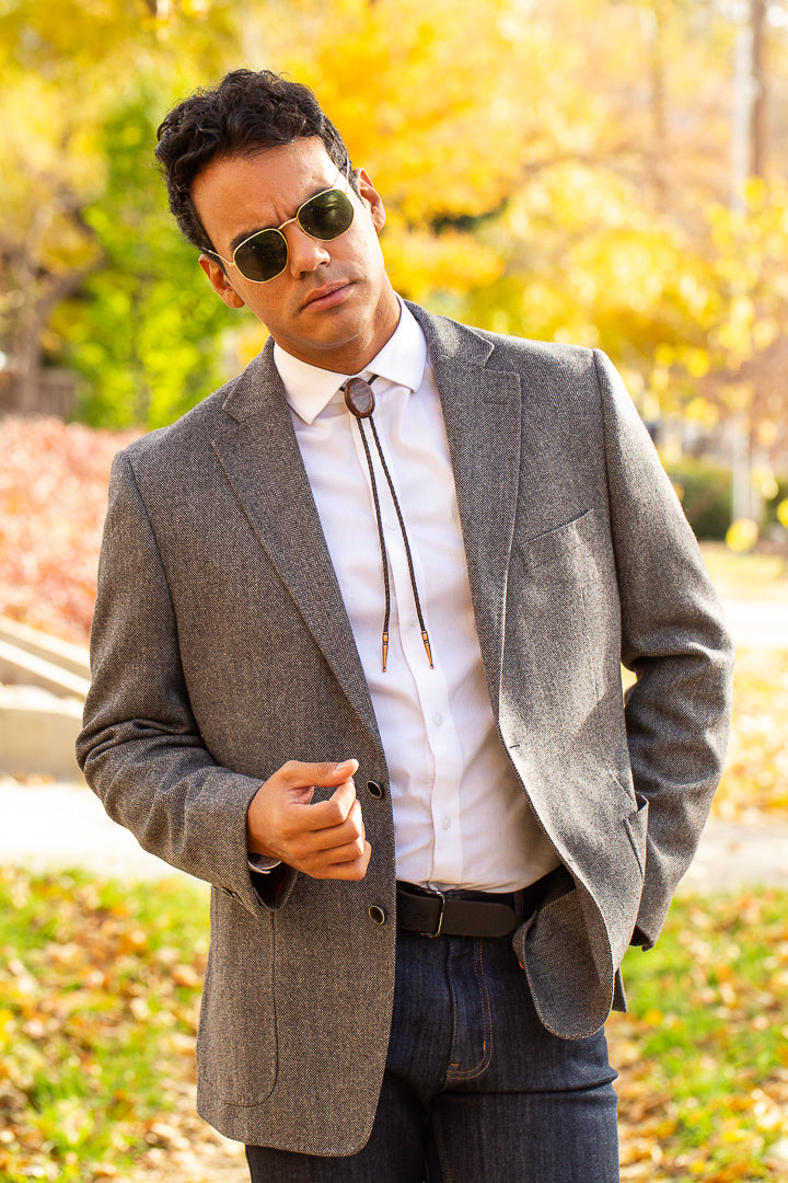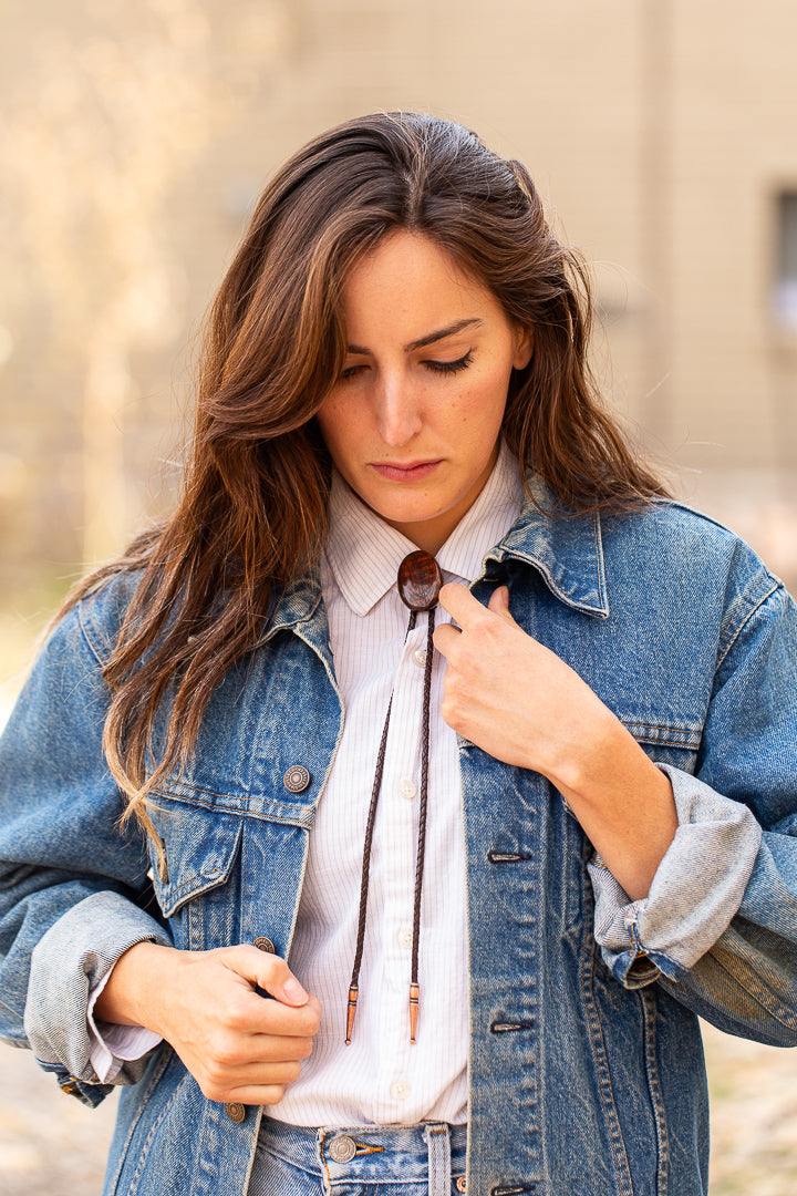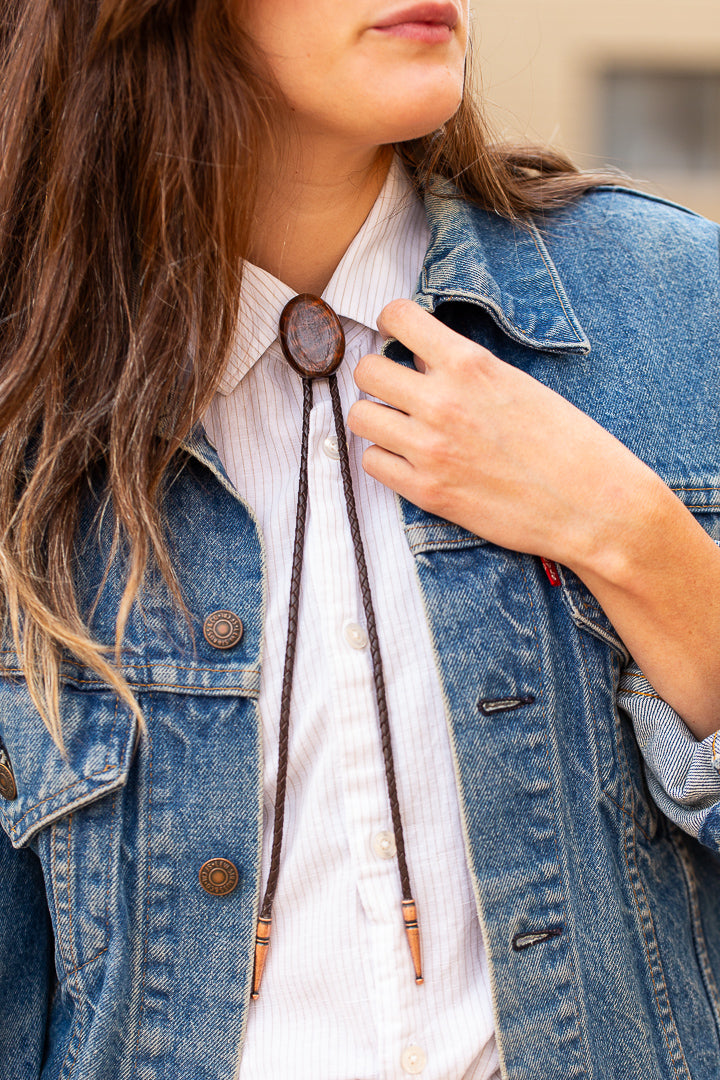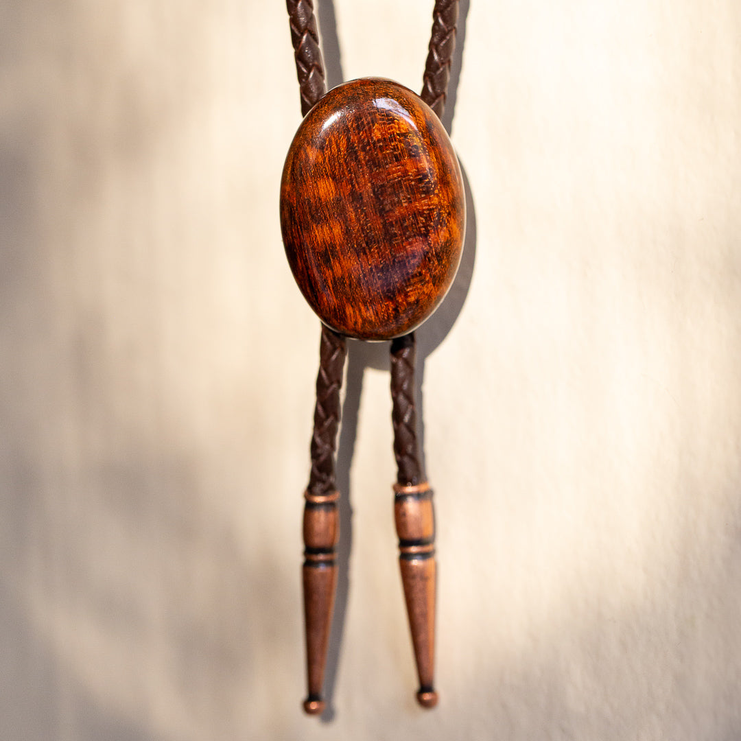 Introducing our Snakewood bolo tie. Hand-crafted with genuine leather tassels and copper tips, this non-traditional wooden tie stands out with its bold design. The glossy water proof polish adds durability for all your daring journeys.
