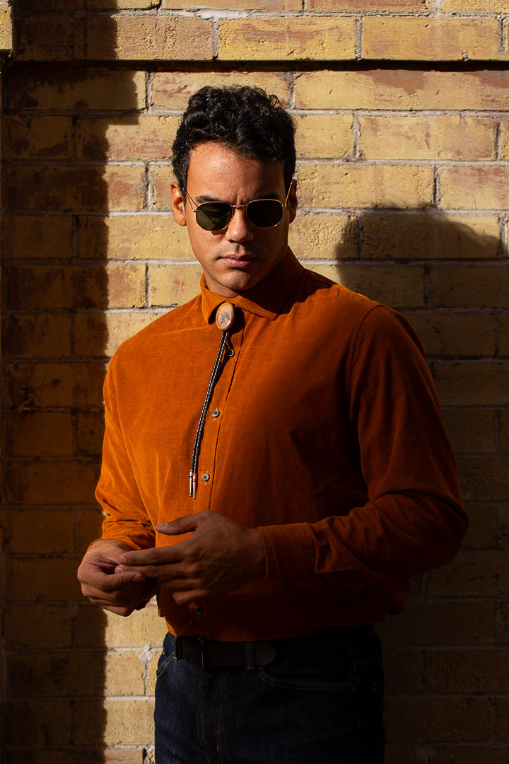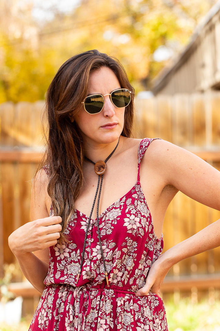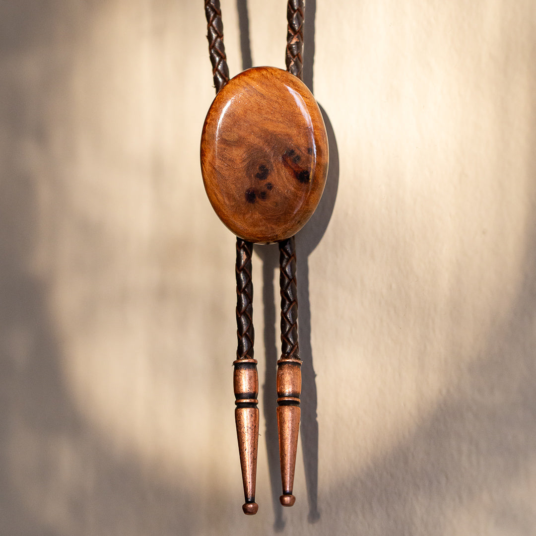 Introducing our Thuya Burl bolo tie. Hand-crafted with genuine leather tassels and copper tips, this non-traditional wooden tie stands out with its bold design. The glossy water proof polish adds durability for all your daring journeys.