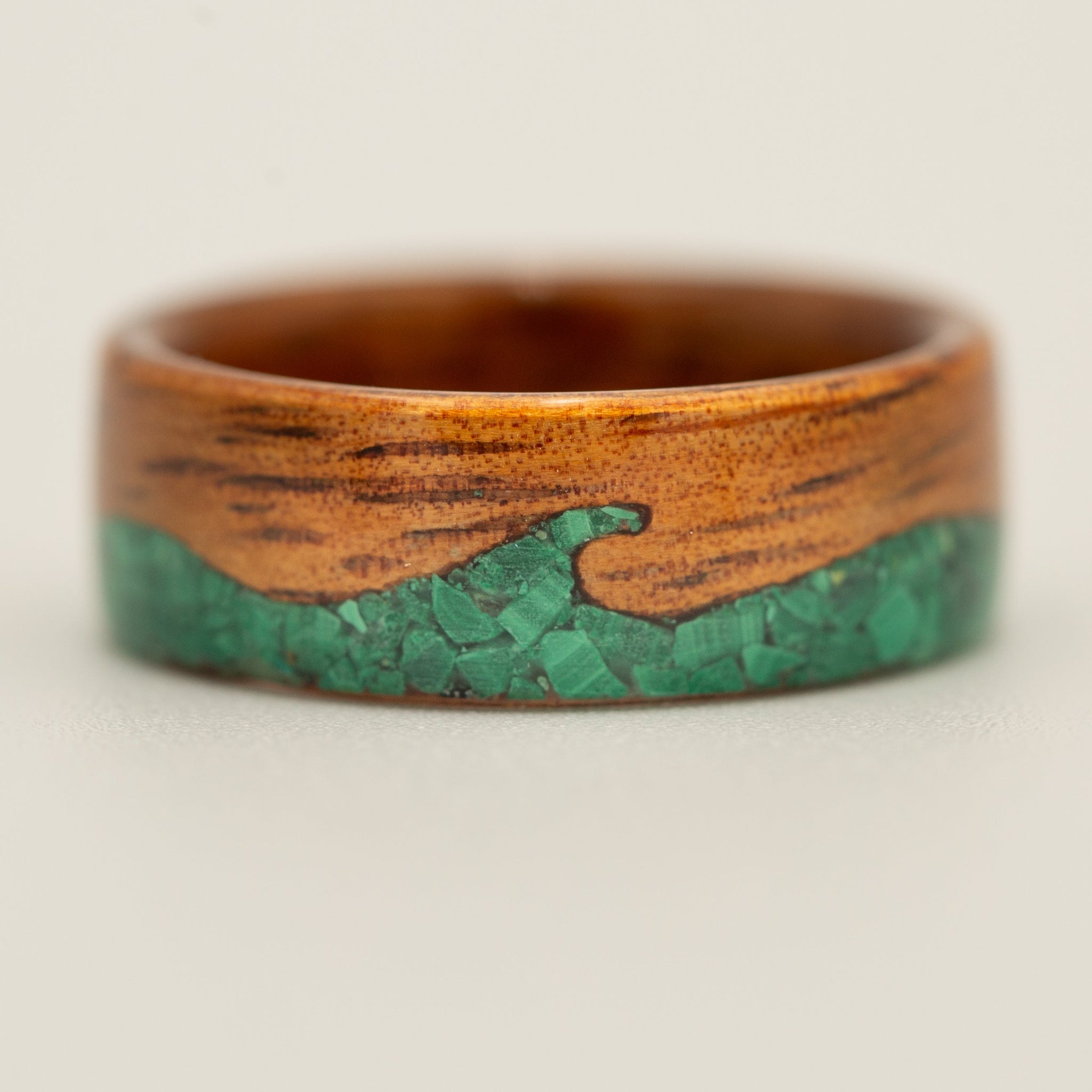 Ride the waves of style with this Koa & Malachite Waves ring! Crafted with Hawaiian Koa wood and accented with a stunning malachite stone, this ring is perfect for beach lovers and surf enthusiasts. Embrace the ocean vibes and make a splash with this unique ring.