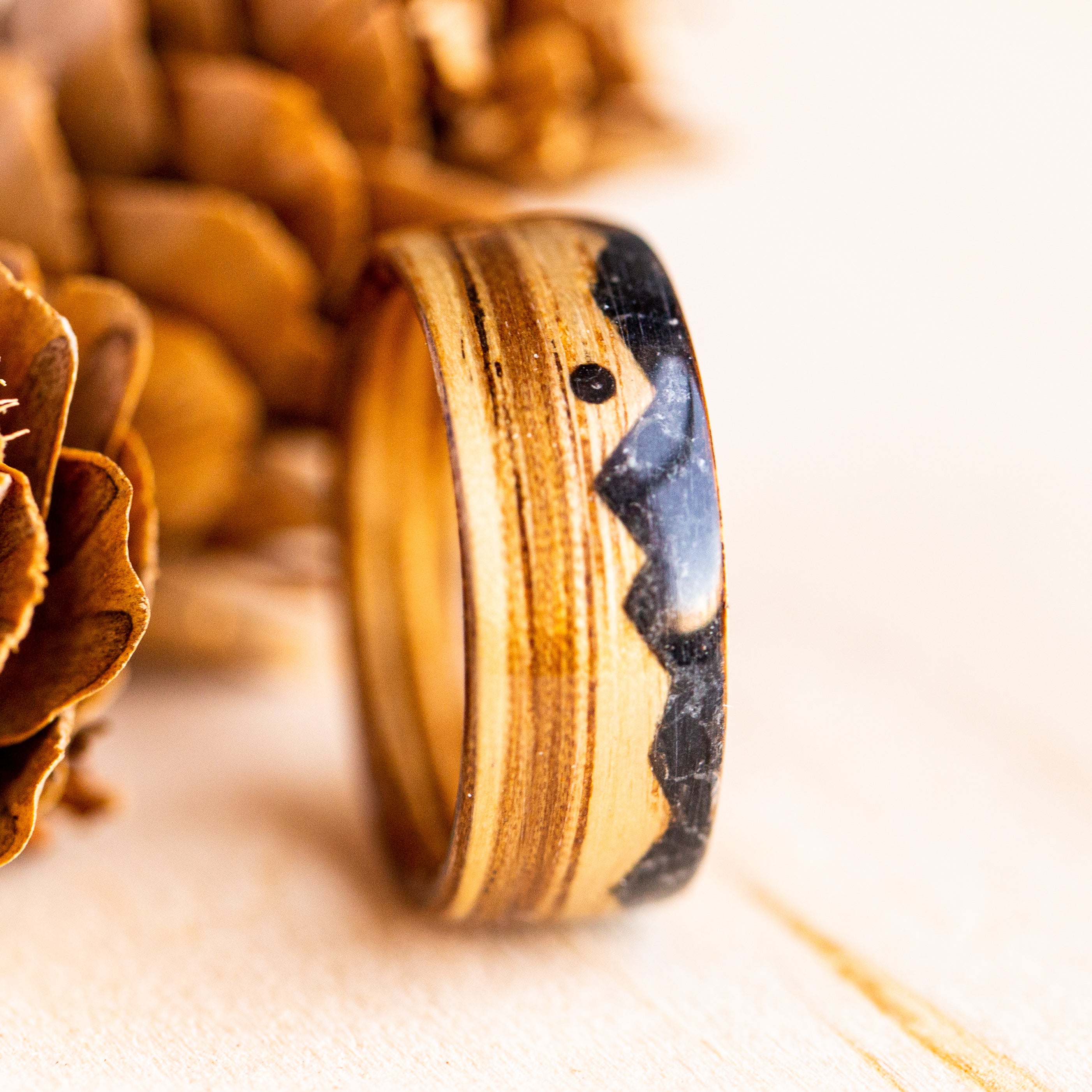 Crafted by hand. The Zebra Mountain in Tourmaline is one of our newest rings. With rich Zebra wood and Black Tourmaline stone, we’ve used a beautiful contrast to create a ring that draws an audience.